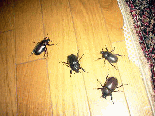 コクワガタのオス3匹、ノコギリクワガタのメス1匹。